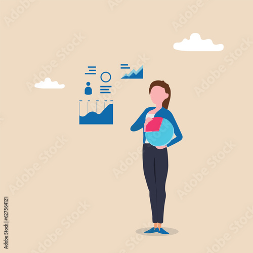 Business report, data diagram and chart, statistics or analytics, data analysis summary or performance, market research concept, businesswoman with report graph and pie chart