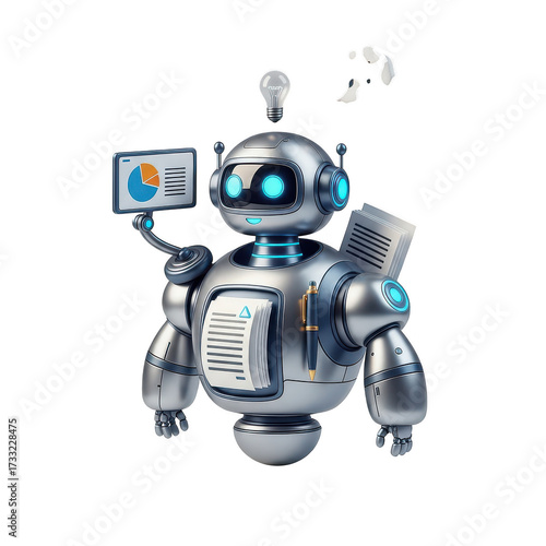 robot, technology, artificial intelligence, ai, automation, datum, futuristic, innovation, business, report, analysis, chart, idea, light bulb, creative, inspiration, solution, document, paper, pen, design, digital, illustration, cartoon, graphic, concept, modern, communication, network, science, engineering, computing, software, development, intelligence, algorithm, smart, device, android, metal, chrome, silver, metallic, isolated, background, black