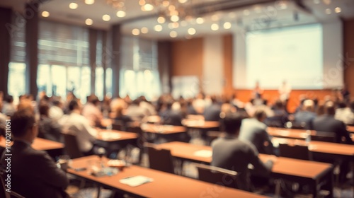Business Seminar Blur: A blurred seminar or workshop setting with speakers and participants, perfect for professional development and learning themes. High quality