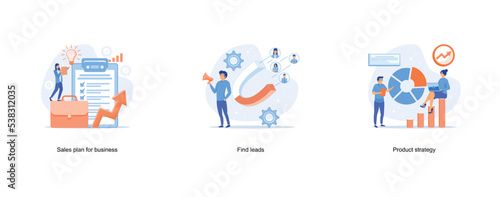 Business strategy planning, Find leads abstract concept, Marketing team working on personal brand, creating corporate identity, advertising profile or web site of female professional, set flat vector