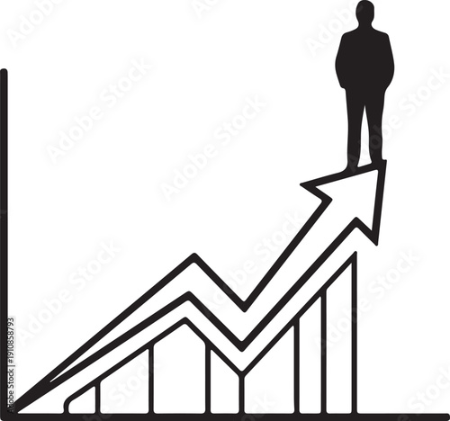 "Business success and leadership vector illustration showing silhouette at peak of upward arrow with bar chart symbolizing achievement, growth, and professional progress"