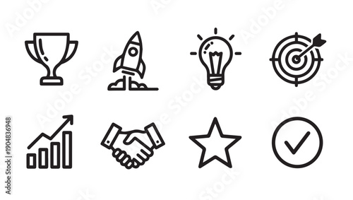 business, success, icon, trophy, rocket, launch, startup, light bulb, idea, innovation, target, goal, dartboard, graph, chart, handshake, partnership, agreements, star, rating, quality, checkmark, tick, approve, confirm, symbol, set, collection, outline, vector, concept, growth, achievement, strategy, teamwork, inspiration, solution, succeed, progress