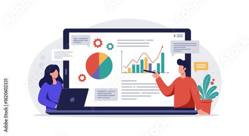 business, datum, analysis, chart, graph, presentation, team, meeting, discussion, information, statistic, report, finance, marketing, strategy, planning, growth, success, progress, performance, review, monitor, digital, screen, laptop, computer, technology, communication, collaboration, teamwork, people, woman, man, illustration, vector, design, modern, flat, colourful, infographic, diagram, pie chart, bar chart, pointing, explaining, sharing