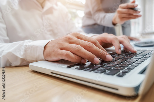Business team brainstorming and discussing with financial data and report graph. Teamwork meeting working concept.
