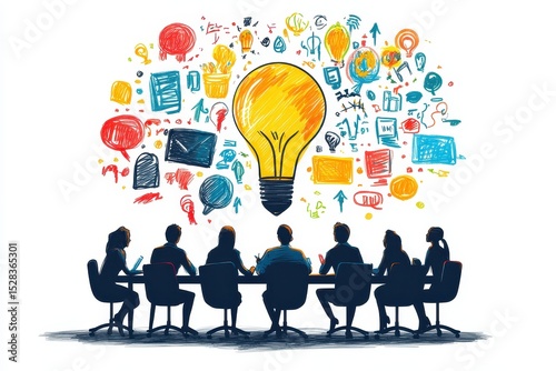 brainstorming, business, team, meeting, conference, table, discussion, idea, idea, light, bulb, creativity, studio, office, people, silhouette, collaboration, creative, process, innovation, problem, solving, teamwork, planning, strategy, communication, solution, project, sharing, success, working, corporate, professional, employee, staff, seminar, workshop, presentation, development, growth, vision, leadership, drawing, icon, graphic, shape, arrow, chart