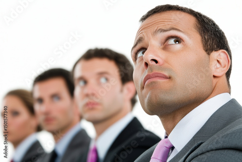 Business team in formal attire listening attentively during meeting, focused and serious expressions, professional environment