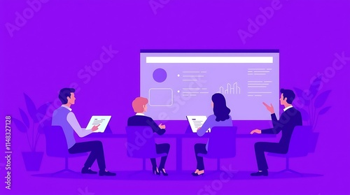business meeting, collaboration, discussion, strategy, analysis, datum, presentation, project, brainstorming, teamwork, professional, office, workplace, work, productivity, innovation, growth, success, technology, digital, modern, illustration, graphic design, purple, screen, table, chair, people, character, planning, solution, idea, engagement, sharpened
