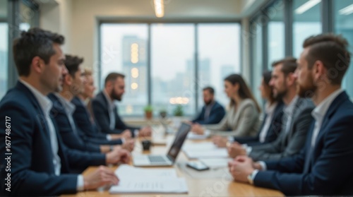 Business team meeting in modern office, executives in formal suits discussing strategy around conference table with laptops and documents.