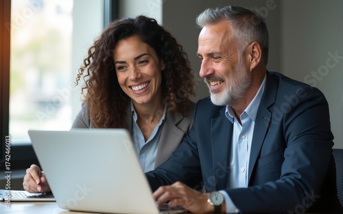 Business team of two executives working together using laptop in office. Happy young business woman manager showing project presentation to mature man client, investor or partner at work meeting.