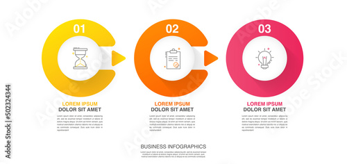 Business vector infographics with three circles and arrows. Timeline visualization with 3 steps for diagram, flowchart, banner, presentations, web, content, levels, chart, graphic