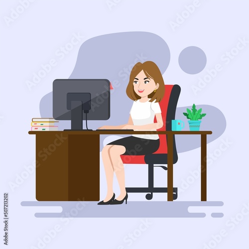 Business woman at work. Office worker woman behind the a work desk. Vector illustration of a flat design.