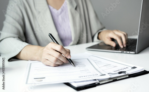 Business woman employer holding resume hiring recruit looking cv resume to hire candidates, analyzing information before job interview. Recruitment concepts