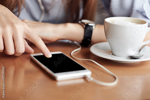 Business woman hands with smart phone and cup of coffee. For Graphic display montage.