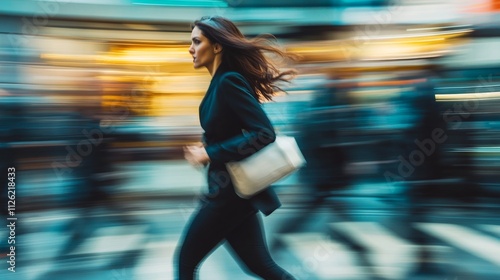 business woman hurry up and running in business city street for rush hour as motion blur