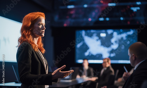 Business Woman on stage at conference holding a presentation of a new product, Speaker having a lecture about digitization, engineering, sustainability, automation.