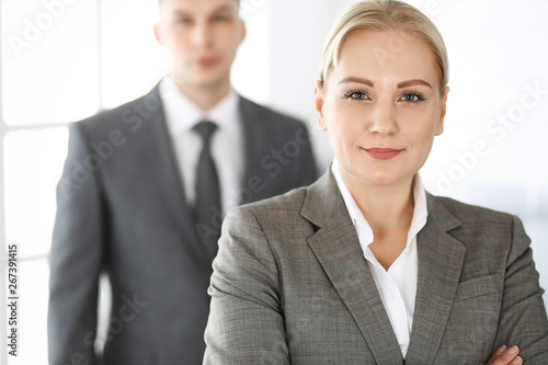 Business woman standing straight with colleague businessman in office, headshot. Success and corporate partnership concept