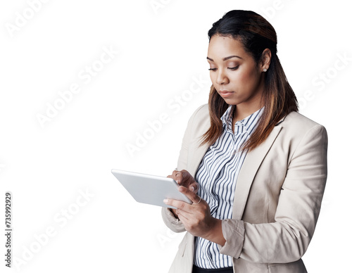 Business woman, tablet and typing for research, communication or networking on a transparent PNG background. Young female person or employee reading on technology for online search, internet or web