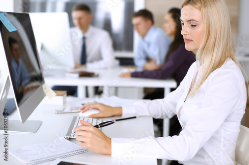 Business woman using computer at workplace in modern office. Secretary or female lawyer smiling and looks happy. Working for pleasure and success