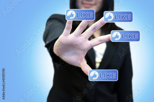 Business woman with hand touching LIKE button on touch screen
