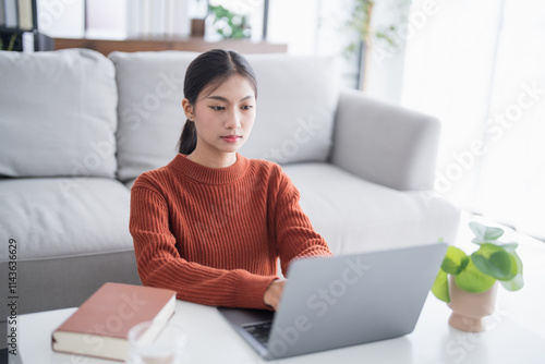 Business woman working from home. work online on laptop. Asian businesswoman working on sofa online business with social distancing laptop online meeting