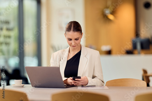 Business Woman Working on Laptop and Phone in a Modern Café Setting