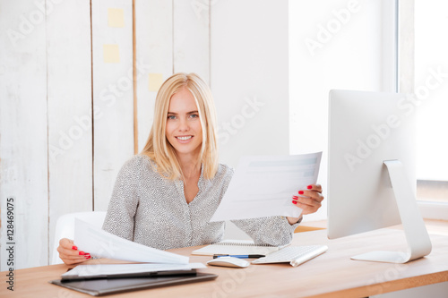 adult, attractive, beautiful, business, businesswoman, casual attire, caucasian, charming, corporate, cute, desk, entrepreneur, executive, female, gorgeous, horizontal, indoor, interior, lifestyle, lovely, office, paper, paperwork, people, person, pretty, professional, success, successful, woman, men at work, working, workplace, young, looking, camera, holding, document, computer, smiling, happy, cheerful