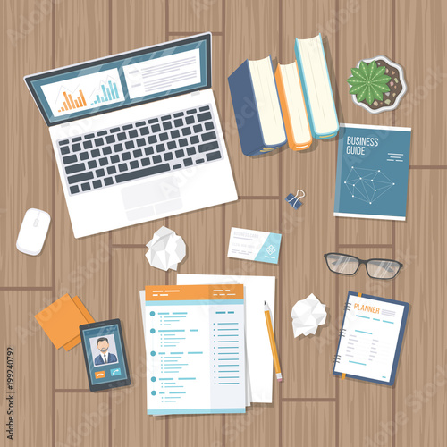 Business workplace with documents, laptop with information on the screen, notepad, phone, books, crumpled paper on the desk. Work, workplace, analysis, research, planning, management. Vector