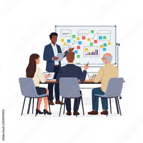 Business Workshop Concept. Vector illustration of a three of diverse people sitting at a table with a woman standing in front of them next to a board with sticky note.