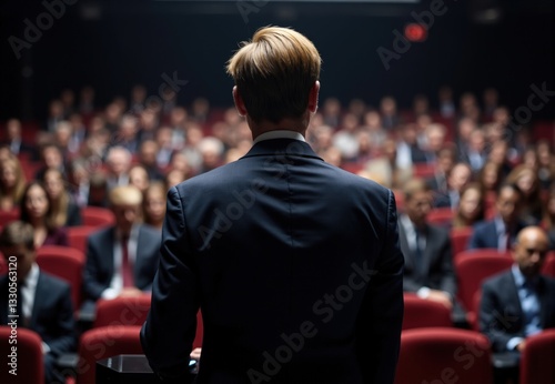 Businessman Addressing a Large Audience in Auditorium