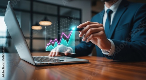 businessman, laptop, graph, increasing, business, finance, technology, datum, digital, success, progress, trend, market, investment, strategy, planning, future, innovation, modern, professional, office, workspace, desk, working, man, hand, stylus, blue suit, dark background, teal, pink, glowing, illuminated, corporate, economy, statistic, report, presentation, analysis, positive
