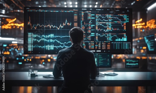 Businessman analyzing stock charts on a large digital screen, financial strategy, 3D illustration