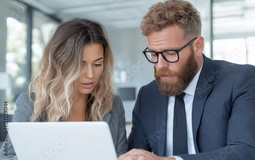 Businessman and businesswoman at a laptop in a modern office. Confidence, success and productivity at work. Business communications, strategy discussion and cooperation in a corporate environment.