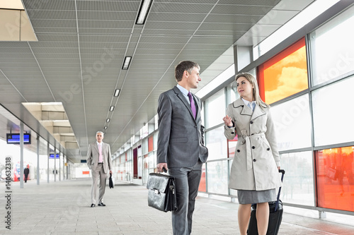 adult, briefcase, business, business travel, businessman, businessperson, businesswoman, carrying, clothing, communication, commuter, conversation, co-worker, female, full-length, indoor, looking, baggage, male, man, middle-aged, occupation, outfit, people, poland, professional, public transportation, railroad, railroad station, suitcase, suit, talking, three, three people, togetherness, transportation, travel, traveling, walking, warsaw, woman, young adult