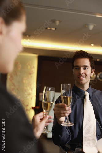 front view, waist up, drinking, holding, smiling, standing, toasting, celebration, cheerful, confidence, content, enjoyment, food and drink, happiness, refreshment, satisfaction, success, teamwork, togetherness, well-dressed, eastern european, young men, missy, selective focus, office, two people, alcoholic beverage, champaign, glasses, adults only, businessman, businesswoman, indoor, business