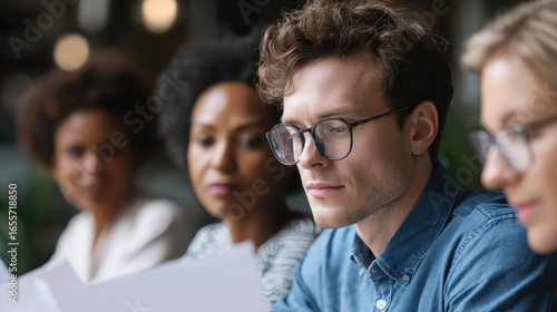 businessman and women having a serious meeting sitting together reading a document or report with focus to a young man in glasses in the foreground no logos no brands ar 169