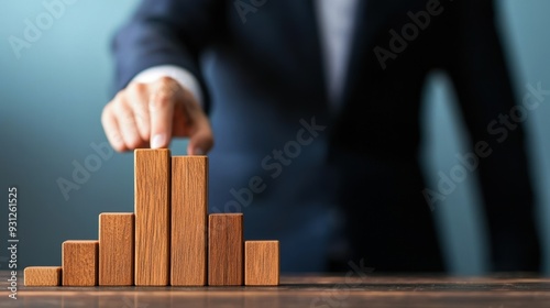 Businessman arranging wooden blocks in growth chart A businessman in a suit arranging wooden blocks in the shape of a growth chart, symbolizing business success, strategy, and progress