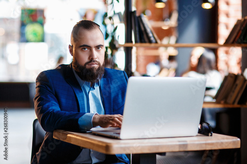 Businessman bearded man in a suit works behind the laptop sitting in a comfortable office coworking.