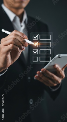 business, man, checking, task, digital, checklist, list, completion, success, goal, objective, strategy, planning, organisation, management, efficiency, productivity, progress, achievement, performance, review, inspecting, survey, feedback, datum, information, technology, tablet, device, mobile, hand, stylus
