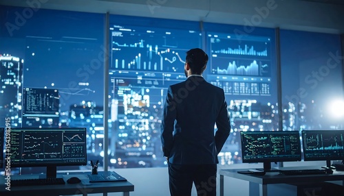 businessman, business, datum, analysis, chart, graph, night, city, city landscape, office, modern, technology, future, success, strategy, planning, finance, investment, market