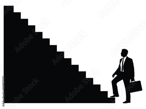 businessman, climbing, stair, silhouette, career, advancement, success, journey, progress, ambition, motivation, growth, professional, executive, manager, corporate, office, job, work, challenge, opportunity, future, leadership, development, male, person, isolated, black, white, graphic, illustration, goal, step, confident, determination