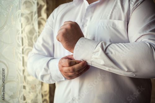 Businessman dress shirt. The man in the white shirt in the window dress cufflinks. Politician, man's style, Businessman buttoning his shirt,male hands closeup, American, European businessman