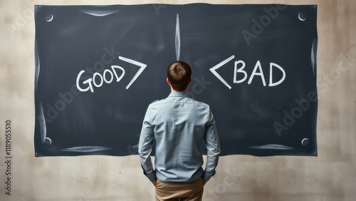 businessman facing chalkboard, decision making, good vs bad choice, back view, white shirt, hands on hips, contemplative pose, dark background, chalk writing, corporate dilemma, strategic thinking, ca