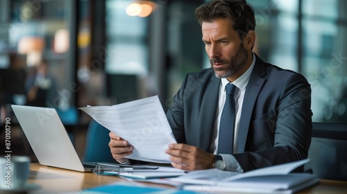 Businessman focused on reading documents in modern office setting, illustrating work and corporate concentration.