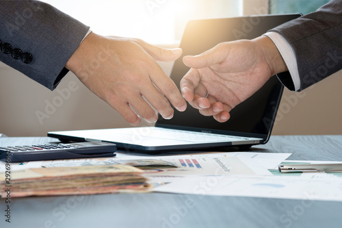Businessman gesture shaking hand for successful dealing negotiation. They achieve and enjoy with marketing business meeting between supplier and customer.