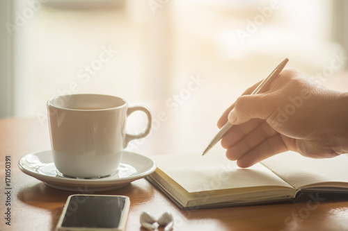 Businessman hand holding a pen writing on paper notebook with coffee cup and smart phone on office table.