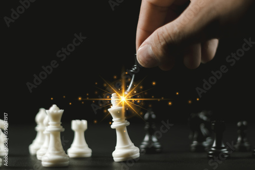 Businessman hand holding and moving white king chess figure with competitor to success play. Business management competition and leadership concept.