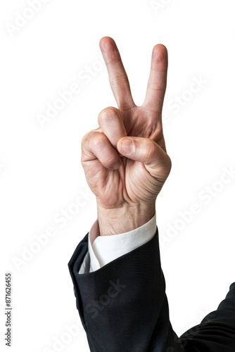 businessman hand making victory sign isolated on transparent or white background, clipping path, cut out, PNG