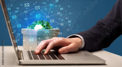 Businessman hand sending a bunch of messages on laptop with cloud computing concept