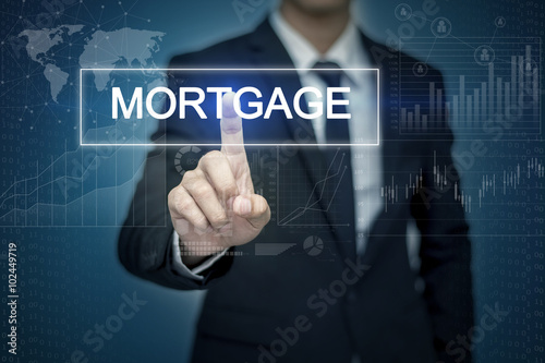 Businessman hand touching MORTGAGE button on virtual screen