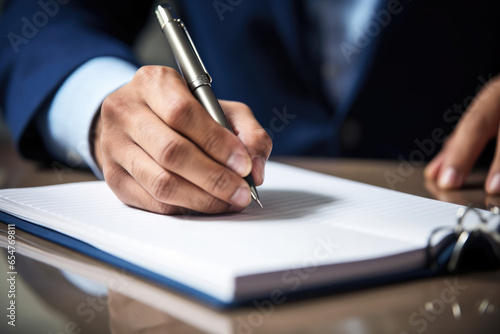 Businessman hand writing in a notebook with a pen